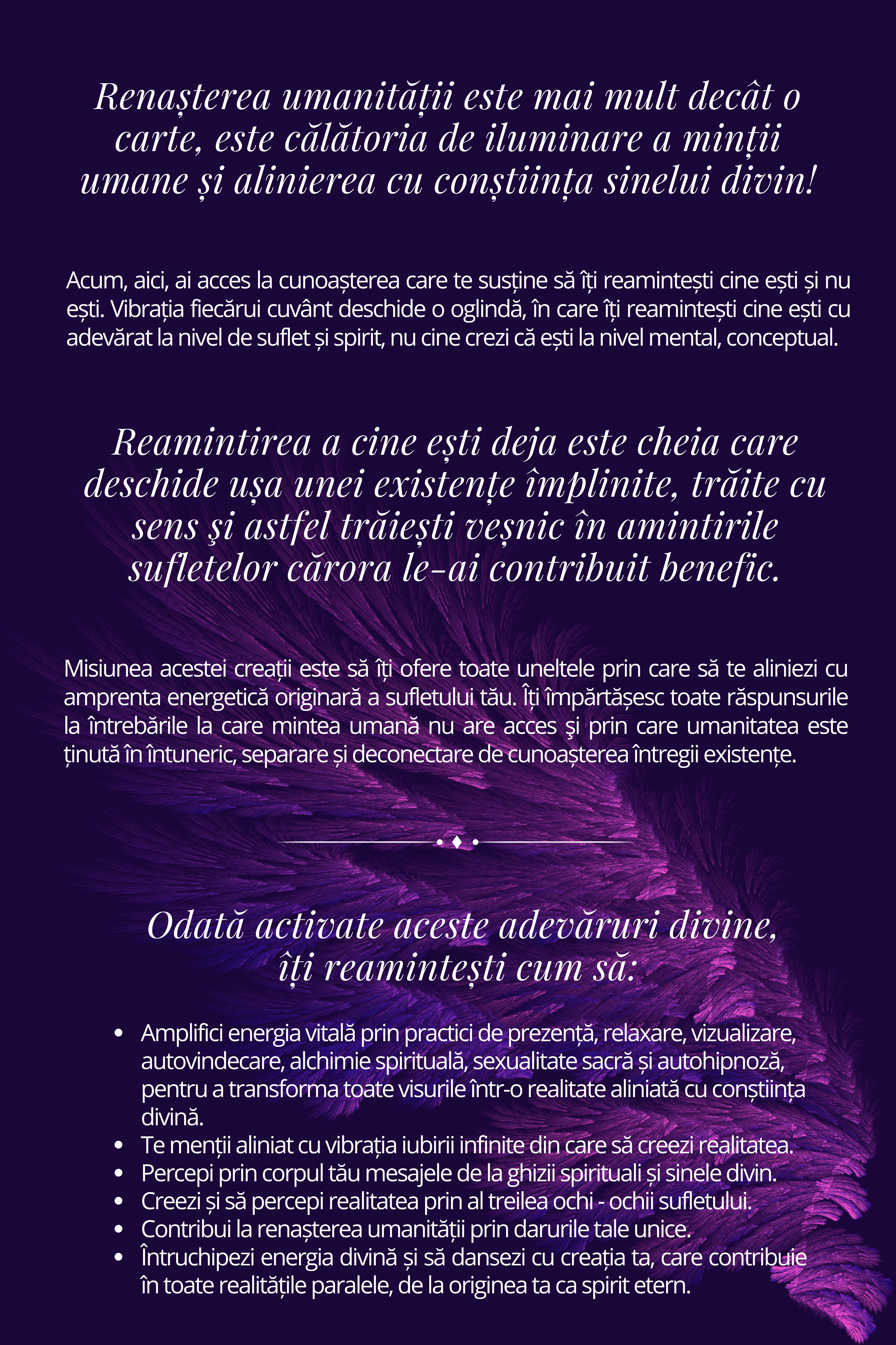 Aleg să fac disponibilă cartea la cât mai multe suflete care aleg să călătorim împreună în lumină, Acasă, în Realitatea Originară, astfel să contribuim împreună la elevarea conștiinței prin alinierea cu niveluri înalte de percepție a realităţii.